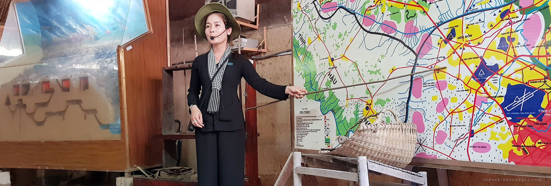 After lunch at a local restaurant, we go back and stop en route for photos shooting at times. We arrive at the well-known Cu Chi area and explore the complicated network of underground tunnels in Cu Chi, which were used by the V.C and guerilla fighters during wartime. Walking along the narrow paths of the tropical forest in Cu Chi to witness the remains of the torn Vietnam War before getting back to your vehicle and transferring back to Saigon in the afternoon.
