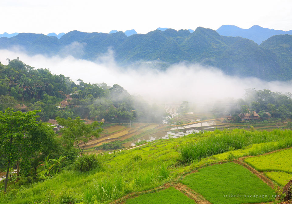 Arrive in Mai Chau at noon, where you’ll be welcomed with lunch at a traditional local house, offering an authentic taste of the region’s cuisine. After your meal, begin an immersive trek through cascading terraced rice paddies and charming small villages, discovering the natural beauty of this pristine valley while encountering the rich culture of the ethnic Thai people. Visit the picturesque villages of Pom Coong and Na Phon, where you’ll have the opportunity to observe traditional stilt houses and interact with friendly local families.