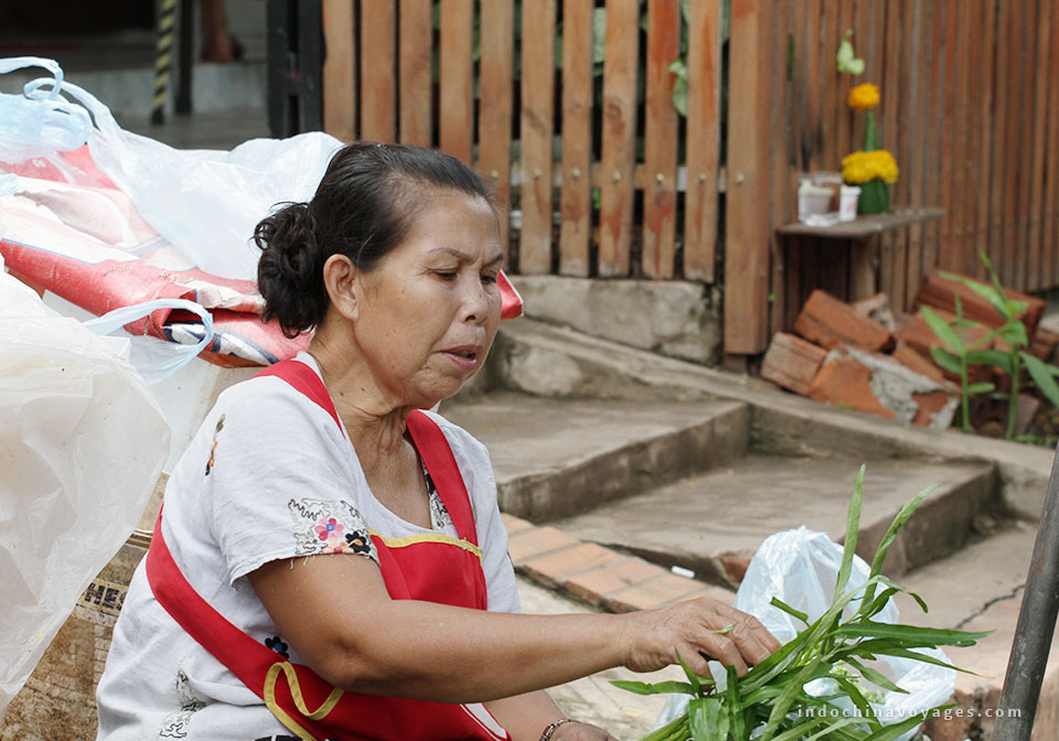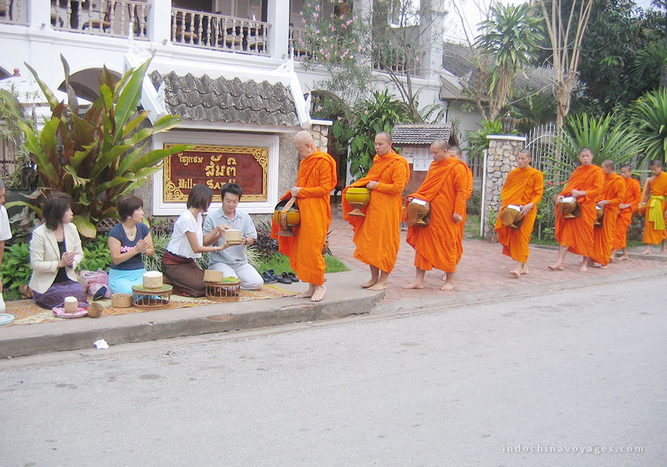 An optional early start gives you the fantastic opportunity to participate in the daily morning rituals of saffron-clad monks collecting offerings of Alms (ubiquitous sticky rice) from the faithful residents. This tradition is very unique in Laos, being the only Buddhist nation still preserving the procession. Around 8:30 am, we drive to Xieng Lom Village and start our elephant day care full day tour: “Inside the hearts of elephants”