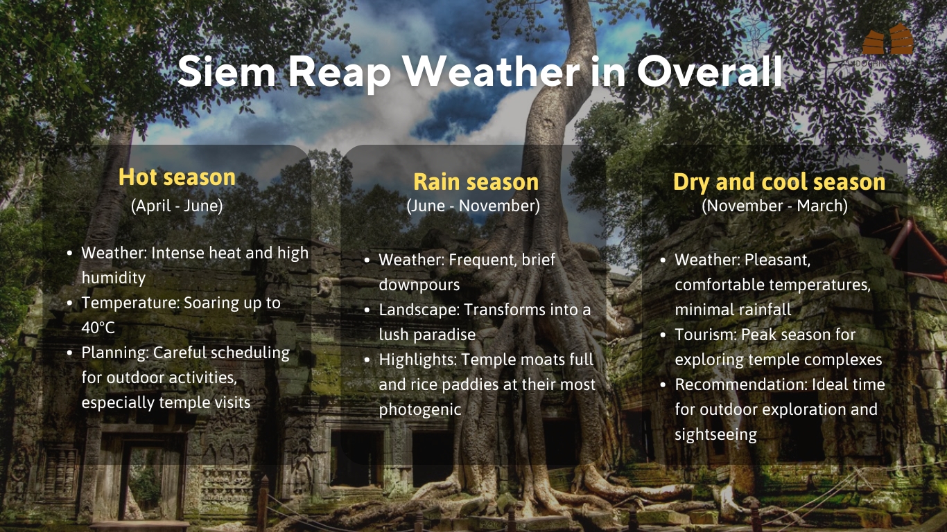The dry and cool season (November-March): offers the most pleasant weather conditions, with comfortable temperatures and minimal rainfall. Due to the perfect weather to explore Siem Reap, this time also makes it the peak tourist season, particularly for exploring the temple complexes.