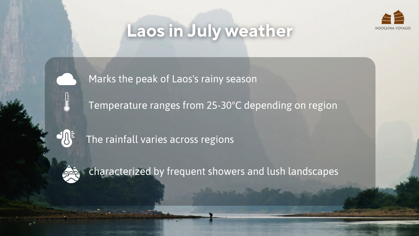 July marks the peak of Laos’s rainy season, characterized by frequent showers and lush landscapes. The average temperature hovers around 26°C (79°F), with average precipitation reaching 245 mm across the country.