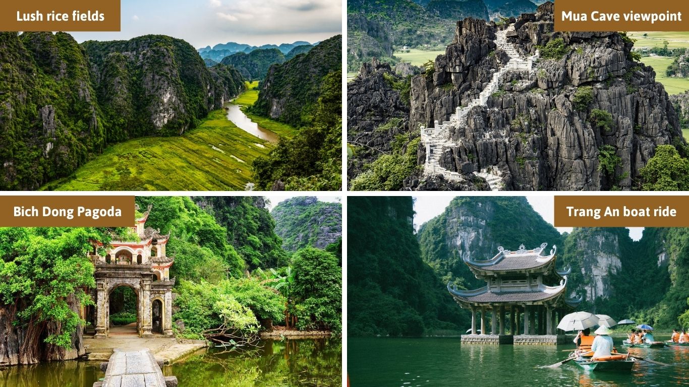- Boat rides through Tam Coc and Trang An (with local women rowing using their feet)
