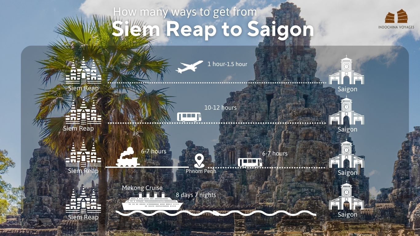The distance between Siem Reap and Saigon is around 570 kilometers (355 miles). Overall and basically, there are 4 ways to depart to Saigon from Siem Reap: