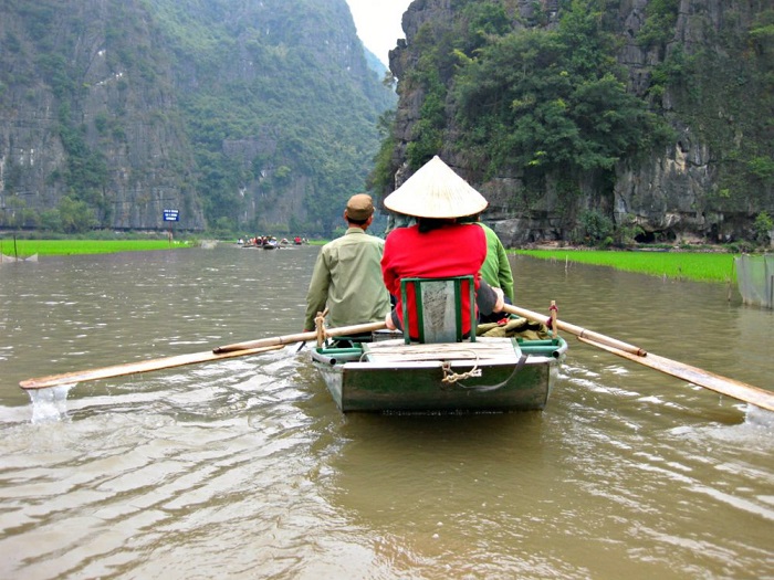 Unlike Trang An, your trip in Tam Coc gives you a wider view of golden rice fields and traditional farming activities through the river banks. Besides, you can take as many pretty pictures of the golden rice field that is surrounded by so many outstanding limestone mountains.