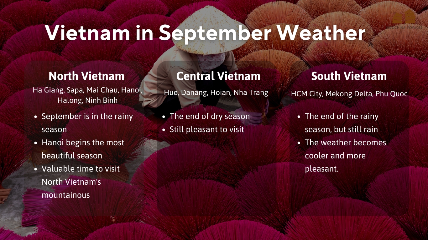 The amount of rainfall in Vietnam during September differs by region. In the north, rainfall decreases as the month progresses because this is the last month in the rainy season in the north. Central Vietnam experiences pleasant weather but could have a small rain at the end of September. In the south, the rainy season comes to an end, resulting in cooler and drier weather.