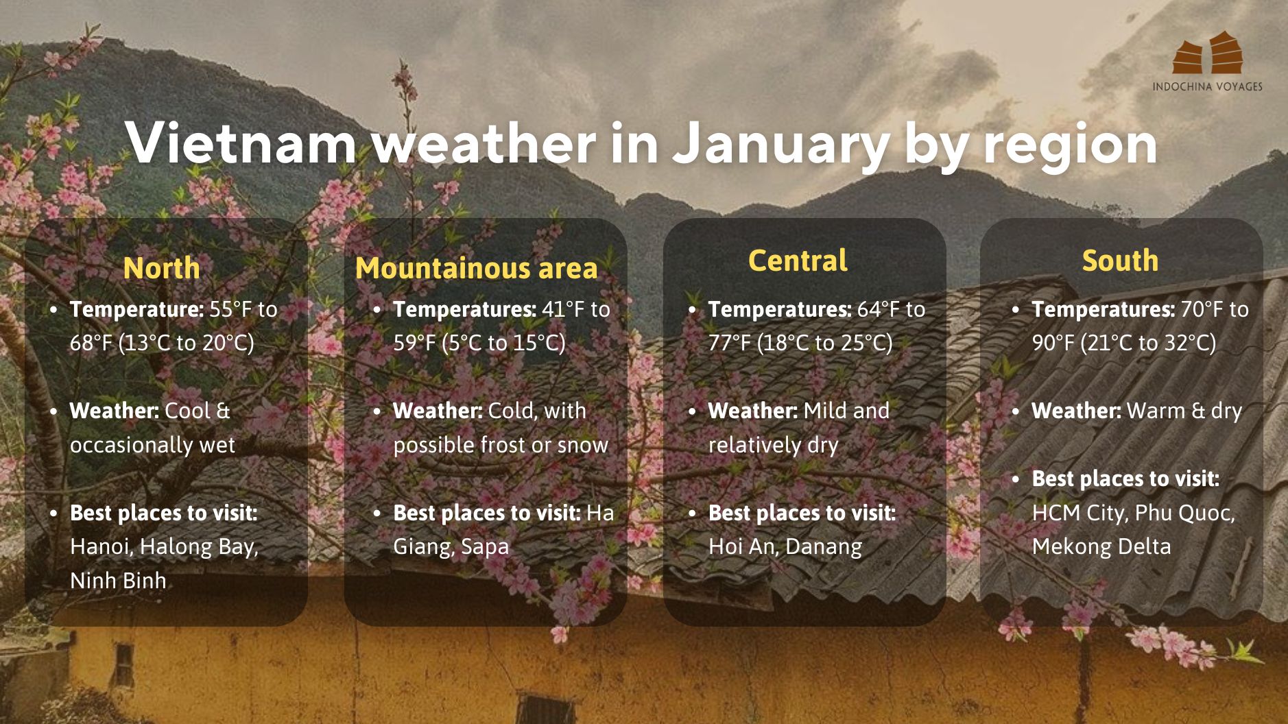 January is an excellent time to visit Vietnam, as the weather is generally mild and comfortable throughout the country. The temperature in Vietnam in January varies by region but usually ranges from cool to warm, making it ideal for exploring both urban and natural attractions.